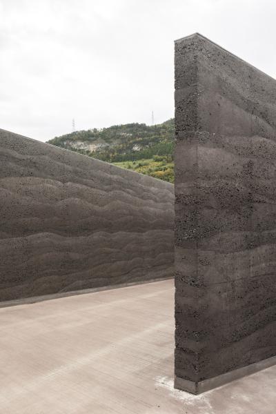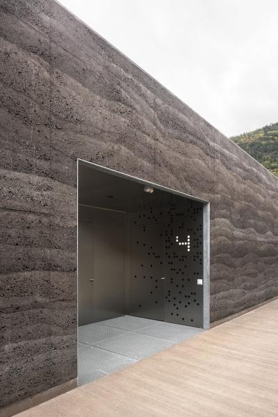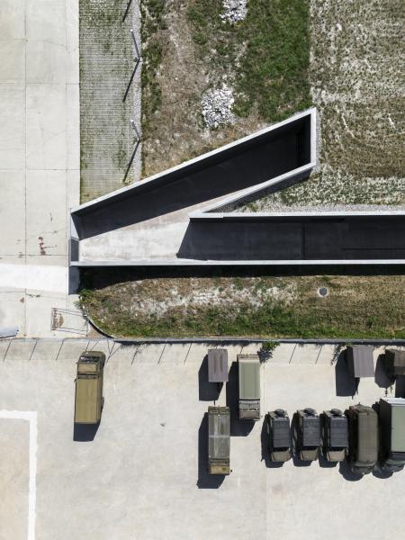 L'ensemble repose sur un seul niveau enterré, permettant une discrétion totale et une réduction du bruit. Seule une fissure, fine et discrète, marque l’entrée de cet ouvrage souterrain, à travers laquelle les véhicules accèdent à ce monde enfoui. La tranchée, référence à la défense d'antan, est la seule présence visible à la surface, un passage carrossable bordé de murs en béton armé damé, texturé comme un sol ancien, exprime la stratigraphie d’un sol composé de couches superposées aux structures sédimentaires différentes, plus ou moins lisses ou granuleuses. L’horizontalité domine, animée par l’ondulation du béton, qui rythme la longue étendue de l’infrastructure.